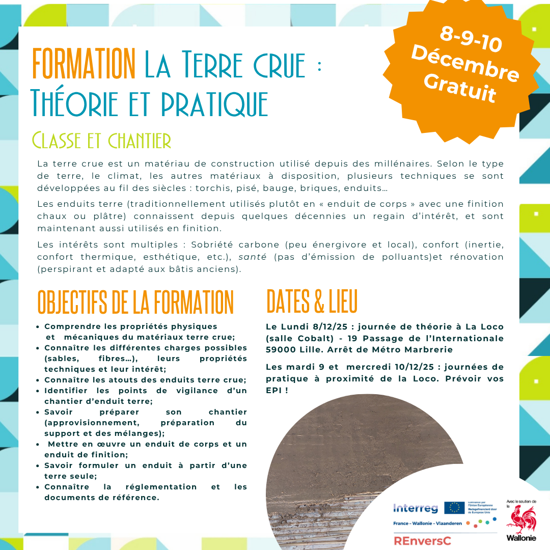 Les 8, 9 et 10 décembre 2025 : formation théorique et pratique sur l’application de la terre crue.